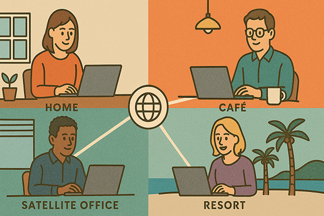 サテライトオフィス勤務は、本社とは別の小規模なオフィス(サテライトオフィス)で働く形です。自宅では働きにくい人でも、通勤時間を短縮しつつ、オフィス環境を利用できます。地方拠点を活用して、人材の居住地の選択肢を広げる効果もあります。
