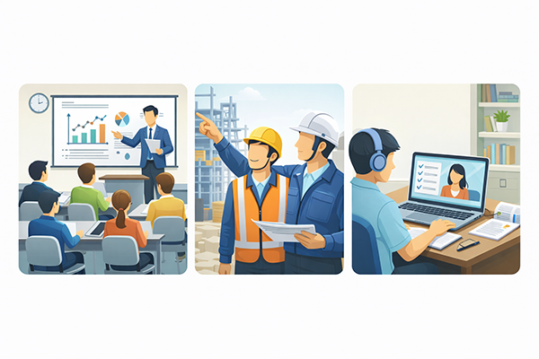 eラーニングは、インターネットや社内ネットワークを通じてPCやスマートフォンから学習する仕組みです。時間や場所を問わず受講できるため、多数の従業員に一斉に教育を行う場合に適しています。