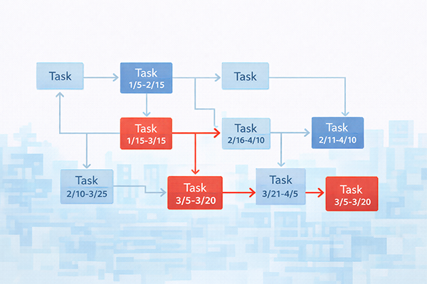 クリティカルパス分析は、PERTで表したネットワークの中から「全体の工期を決める最も時間のかかる経路(クリティカルパス)」を見つける手法です。クリティカルパス上の作業が遅れるとプロジェクト全体が遅れるため、重点的に管理すべき作業として把握できます。