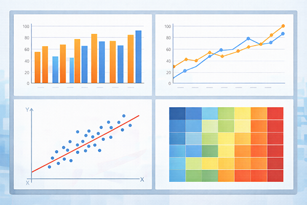 この章では、日常的に使うことが多い各種グラフ・チャートを整理します。目的に応じて適切な可視化手法を選ぶことで、他者にデータを分かりやすく説明し、不適切なグラフにだまされない力も身につきます。