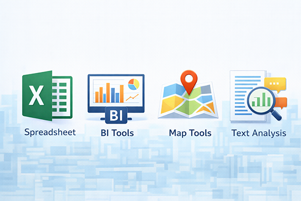 分析や可視化を行うツールには、表計算ソフト、BIツール、統計ソフト、GISソフトなど多様なものがあります。大量データを扱うのか、リアルタイム表示が必要なのか、地図表示が必要なのかといった目的に応じて、適切なツールを選ぶことが重要です。