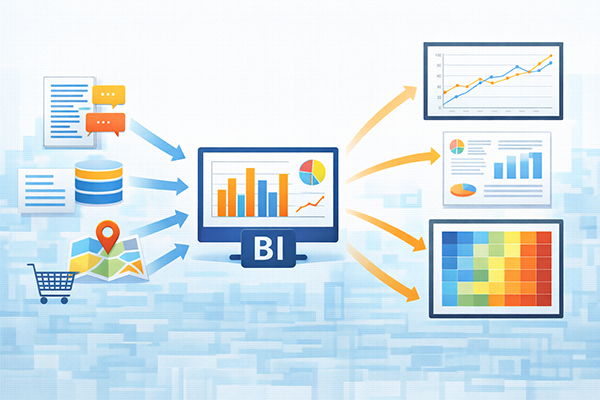 BI(Business Intelligence)は、企業内のデータを集約・可視化し、経営判断や業務改善に役立てる仕組みやツールです。ダッシュボードやレポート機能を通じて、現場から経営層までが共通の数字をリアルタイムで確認できるようにします。