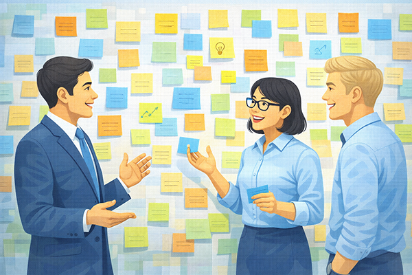 進行役(ファシリテーター)は、場の雰囲気を整えながら、手法がルール通りに機能するようサポートします。ブレーンストーミングでは、特定の人の発言に偏っていないかを観察し、まだ発言していない人には「何か追加でアイデアはありますか?」と問いかけるなど、参加のバランスを取る工夫が重要です。意見が途切れたときには、視点を変える質問を投げかけることで、再び発想を促すこともできます。