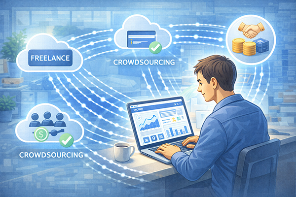 クラウドソーシングは、インターネット上のプラットフォームを通じて、企業や個人が仕事を依頼し、フリーランスなどの受注者がその仕事を請け負う仕組みです。