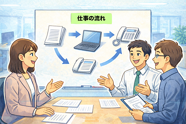 業務プロセスとは、企業の中で仕事がどのような手順で進んでいくかという「一連の流れ」のことです。例えば、注文を受けてから商品を発送し、代金を回収するまでの一連の手続きが、典型的な業務プロセスの例です。