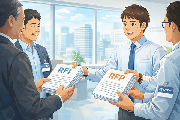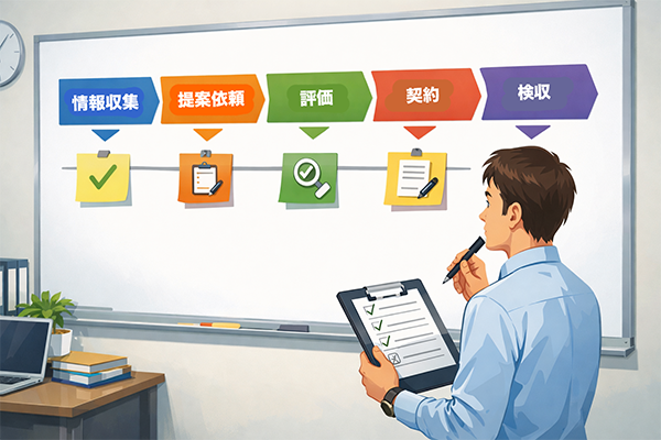 まず、候補となるベンダーや製品について情報を集める段階から始まり、続いてRFP(提案依頼書)をベンダーに配付して具体的な提案を募ります。集まった提案書や見積書を、あらかじめ決めた選定基準に照らして比較評価し、その結果をもとに調達先を選定します。