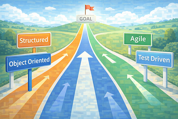 本記事では、代表的なソフトウェア開発手法として、処理の流れを重視する構造化手法と、現実世界の「モノ」を中心に設計するオブジェクト指向を確認しました。どちらも、複雑なソフトウェアを整理し、理解しやすく保守しやすい形に分解していくための考え方です。