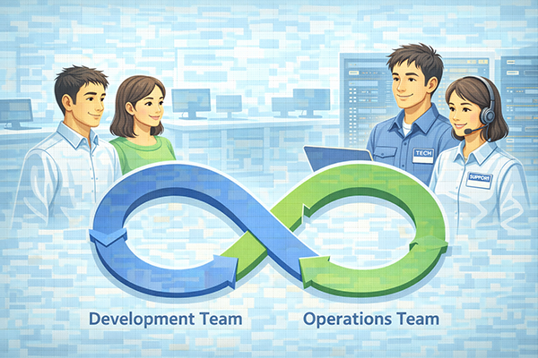 DevOpsは、「Development(開発)」と「Operations(運用)」を組み合わせた言葉で、開発チームと運用チームが密に連携しながら、短いサイクルでソフトウェアを改善し続ける考え方です。従来は、開発が終わったあとに運用へ引き渡す、という分断された進め方が一般的でしたが、DevOpsでは、企画・開発・テスト・運用・監視を一体のプロセスとして扱います。