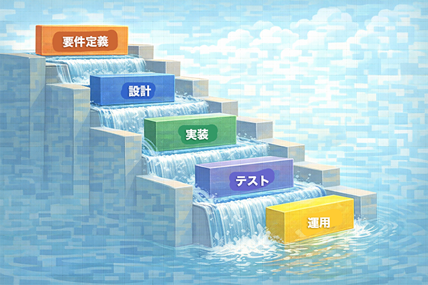 ウォーターフォールモデルは、要件定義、設計、プログラミング、テスト、導入・保守といった工程を、原則として一方向に順番に進めていく開発モデルです。上流工程が完了してから次の工程に進むため、川の水が段々を流れ落ちる「滝(ウォーターフォール)」にたとえられています。