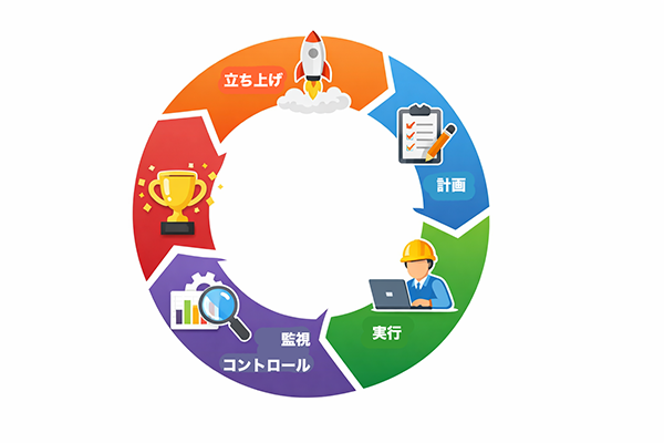 この章では、プロジェクトマネジメントがどのような流れで進むのかを整理します。プロジェクトを立ち上げ、計画に基づいて進め、レビューなどを通じて進捗・コスト・品質・資源を管理しながら目標達成へ導く、一連のプロセスをイメージできるようにしていきます。