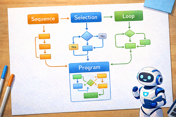 本記事では、コンピュータが処理を行うときの筋道であるアルゴリズムについて、その中でも特に重要な「順次」「選択」「繰返し」という三つの基本構造を中心に、フローチャートや日常の例を交えながら分かりやすく整理します。