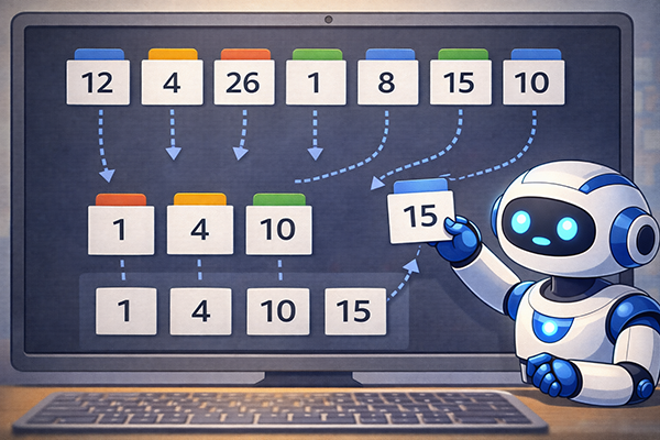 この方法は、「何をしているのか」が非常にイメージしやすいのが利点です。一方で、各ステップで最小値を探すために残りの要素を一通り調べる必要があり、データ数が多くなると比較の回数が急激に増えてしまいます。学習用の例としては扱いやすいものの、大量データ向けの実用的なソートとしては、もっと効率の良い手法が選ばれることが多いです。