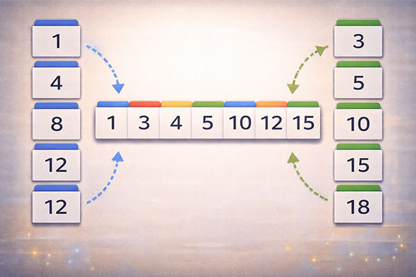 整列済みの二つの列をマージする場合、先頭どうしを比べて小さい方を結果の列に移し、その列の次の要素ともう一方の先頭をまた比べる、という操作を繰り返すのが基本です。この方法を使うと、両方の列を全部確認しながらも、余計な並べ替えをすることなく、効率よく併合が行えます。ソートアルゴリズムの中には、このマージの考え方を組み込んだ「マージソート」という手法も存在します。
