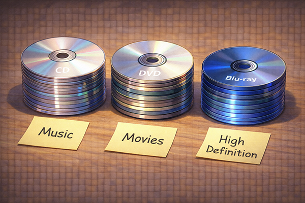 光ディスクでは、CD・DVD・ブルーレイディスクと世代が進むにつれて記録容量が増え、音楽から映画、高画質映像へと用途の中心が変化してきました。また、読み出し専用のROMタイプと書き込み可能なR/RAMタイプの違いを通じて、「一度配布したら中身を変えたくないのか」「何度も書き換えながら使いたいのか」といった利用目的に応じて媒体を選ぶ考え方も整理しました。光ディスクはオンライン配信の普及で出番が減りつつありますが、オフラインでの配布や長期保存の手段として、今も一定の役割を持っています。