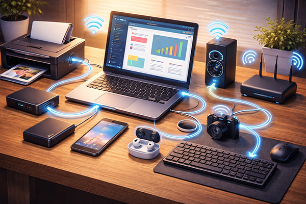 Bluetoothは、数メートルから数十メートル程度の近距離で、音声やデータを無線伝送するための規格です。ワイヤレスイヤホンやスピーカー、マウス、キーボード、スマートフォンとPCのテザリングなど、日常的な周辺機器との接続に広く使われています。ペアリングと呼ばれる手順で機器同士を登録し、一度登録しておけば自動的に再接続できるのが便利な点です。