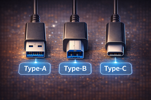 コネクタ形状にはいくつかの種類があります。もっとも馴染みのあるのが、PC側に搭載される平たい長方形のType-Aです。プリンタなどでよく見かける四角に近いType-Bや、その小型版(Micro-Bなど)は主に周辺機器側で使われてきました。近年は、上下の向きを気にせず挿せる小型のType-Cが台頭しており、ノートPCやスマートフォン、タブレットなどで採用が広がっています。Type-Cは給電能力も高く、映像出力や他のプロトコルを同じコネクタで扱える点が特徴です。