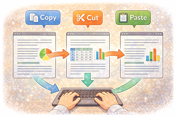 クリップボードとは、一時的にデータを保管しておく領域のことです。文書作成ソフトで「コピー」や「切り取り」をすると、その内容がクリップボードに保存され、「貼り付け」操作によって、同じ文書内や別の文書、さらには他のアプリケーションにも挿入できます。たとえば、表計算ソフトで作ったグラフをコピーして、文書作成ソフトに貼り付けるといった使い方が代表的です。