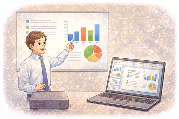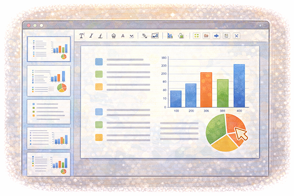本記事では、プレゼンテーションソフトの基本機能を使ってプレゼンテーション資料を作成する方法や特徴を整理し、スライドの作成、フォントの選択、図形の作成、画像の取込みといった具体的な活用例をわかりやすく解説します。プレゼン資料づくりの流れを頭の中でイメージしながら読めるように、画面操作のポイントと資料作成のコツをあわせて確認していきましょう。