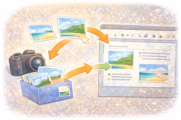 画像の取込みでは、「挿入」メニューなどから画像ファイルを選択し、スライド上に配置します。ファイルとして保存されている写真やロゴだけでなく、クリップアートやアイコン、オンライン画像を挿入できる場合もあります。また、他のソフトで表示している画面をキャプチャして貼り付ければ、操作手順の説明スライドも簡単に作成できます。