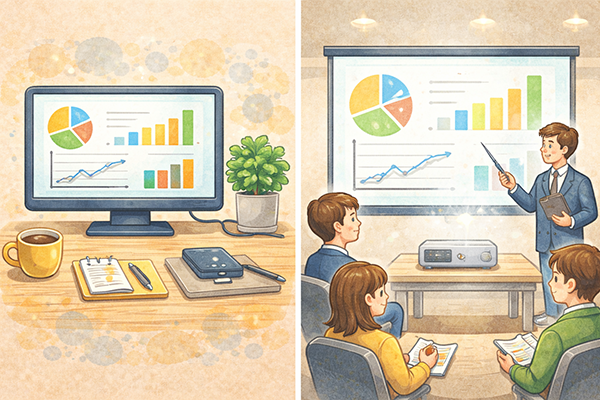 この章では、コンピュータが処理した結果を画面に表示したり、大勢の人に見せたりするための出力装置を取り上げます。日常のPC作業から会議や授業でのプレゼンテーションまで、視覚情報の提示に欠かせない装置です。