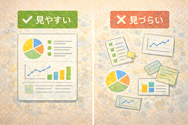 情報デザインの出発点は、「頭の中にある情報を外に取り出し、見える形にして整理すること」です。文章や数字だけの状態では、量が増えるにつれて全体像がつかみにくくなります。そこで、図や表、レイアウトなどを使って情報を可視化し、どの情報がどことつながっているのかを明らかにしていきます。