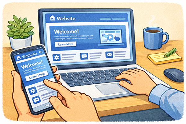この手法の利点は、デバイスごとに別々のページを用意しなくてよいことです。スマホ用・PC用の2つのサイトを維持しようとすると、内容を更新するたびに両方を修正しなければならず、管理が大変になります。レスポンシブWebデザインであれば、1つのコンテンツを更新すればすべてのデバイスに反映されるため、メンテナンスの手間を減らしつつ、どの端末からでも見やすいサイトを提供できます。