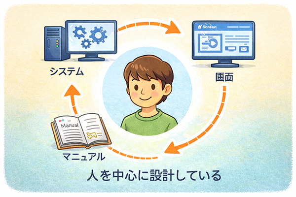 これに対して人間中心設計では、たとえば「ユーザーはこの業務を10分以内に終えたい」「パソコンに慣れていない人も使う」といった前提を大切にします。その前提に合わない機能や操作手順は、たとえ開発側としては都合がよくても見直しの対象になります。つまり、人間中心設計は「技術的に可能かどうか」だけでなく、「人にとってどうか」という観点で設計を評価するアプローチだと言えます。