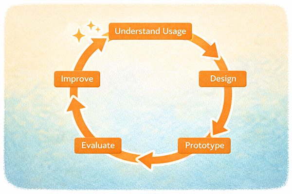評価の結果を踏まえて設計を修正し、再び試作と評価を繰り返すことで、徐々にユーザビリティを高めていきます。このようなサイクルを複数回まわすことで、最終的にユーザーの要求に合ったシステムに近づきます。重要なのは、「一度作って終わり」ではなく、「試して直すこと」が前提になっている点です。人間中心設計では、この反復プロセスこそが品質向上の鍵となります。