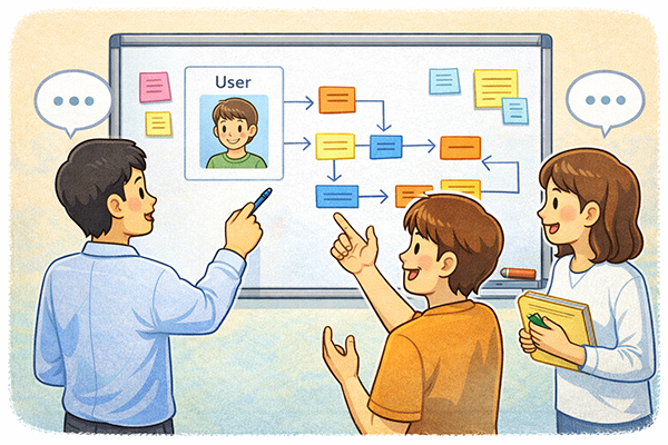 人間中心設計では、設計の途中段階から実際のユーザーに参加してもらうことが重視されます。開発者だけで画面案を作り込んでしまうと、利用者の現場感覚からズレたシステムになってしまうことがあるためです。ユーザーインタビューやアンケート、試作品(プロトタイプ)を実際に触ってもらうテストなどを通じて、利用者からのフィードバックを集めます。