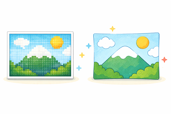 静止画処理の世界では、まずコンピュータが画像をどのように表現しているかを理解することが大切です。ピクセルの集まりとして表現するラスターデータと、線や図形を数式で表現するベクターデータという2つの考え方を押さえておくと、どの形式がどの用途に向いているのかが見えやすくなります。写真にはラスタ、ロゴやイラストにはベクタという大まかな使い分けをイメージしておきましょう。