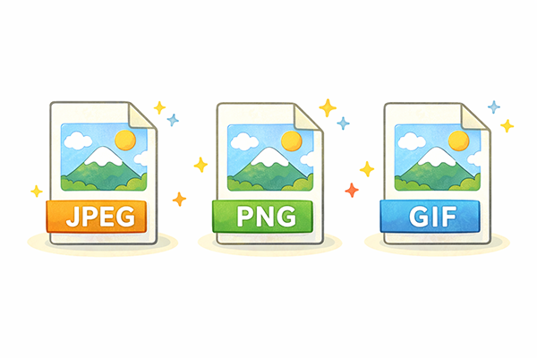 JPEGのメリットは、写真などのフルカラー画像を、比較的小さなファイルサイズで保存できることです。一方で、何度も保存し直すと圧縮による劣化が累積し、輪郭がにじんだりブロック状のノイズが目立ったりすることがあります。また、透過情報(透明部分)やアニメーションには対応していません。写真中心で、ファイルサイズを小さくしたい場合に適した形式です。