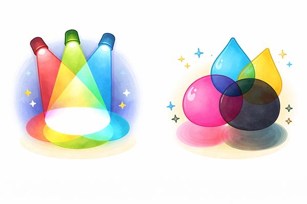 プリンタや印刷機で使われるCMY/CMYKは、この減法混色の考え方に従っています。シアンとイエローを重ねると緑が、マゼンタとイエローを重ねると赤が強く見えるのは、不要な光が吸収された結果として残った光がそのような色に感じられるからです。画面のRGBと印刷のCMYKで色が違って見えるのは、加法混色と減法混色という仕組みの違いによるものだと理解すると、色合わせの難しさも納得しやすくなります。