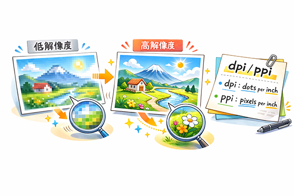 この章では、画像の品質に関わる要素として、画素(ピクセル)、dpi、ppi、解像度、画面解像度、階調について説明します。どれも似たような言葉に見えますが、「どれだけ細かく」「どれだけなめらかに」表現できるかを別々の角度から示していると考えると整理しやすくなります。