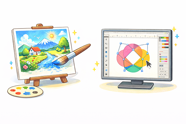 ペイント系ソフトウェアは、写真のレタッチや陰影の豊かなイラスト、絵の具のような質感を生かした表現が得意です。一方で、一度描いた線を大きく拡大すると画質が荒れやすく、線の太さや形だけを後からきれいに変更するのは少し苦手です。ラスターデータという性質上、「描いたサイズ付近で使う画像」や「写真のような複雑な色変化を伴う画像」に向いていると考えると分かりやすくなります。