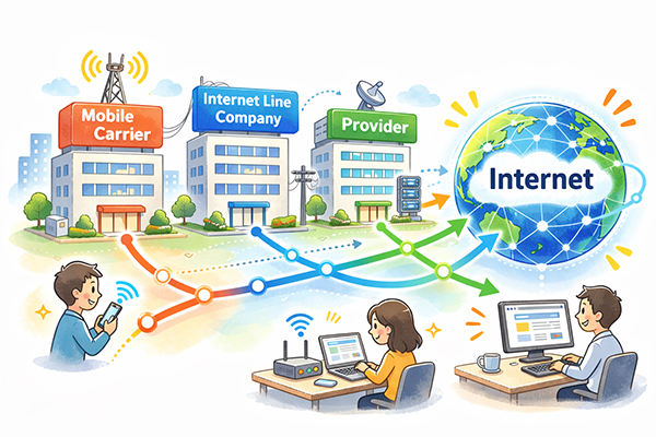 利用者は、回線事業者と直接契約する場合もあれば、後述するISPや携帯キャリアを通じて間接的に回線を利用している場合もあります。誰と契約しているかによって、料金プランやサポート窓口が変わりますが、実際にデータを運んでいる物理的なインフラを押さえているのは回線事業者である、という点を意識しておくと整理しやすくなります。