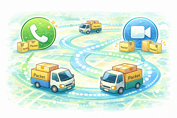 IP電話は、音声データをIPネットワーク上のパケットとして送受信する電話サービスです。従来の固定電話回線では音声専用の回線を使っていましたが、IP電話ではインターネット回線や企業内ネットワークを利用して通話します。スマートフォンのアプリ同士で通話するサービスや、光回線を使った家庭向け電話サービスなどがIP電話の代表例です。