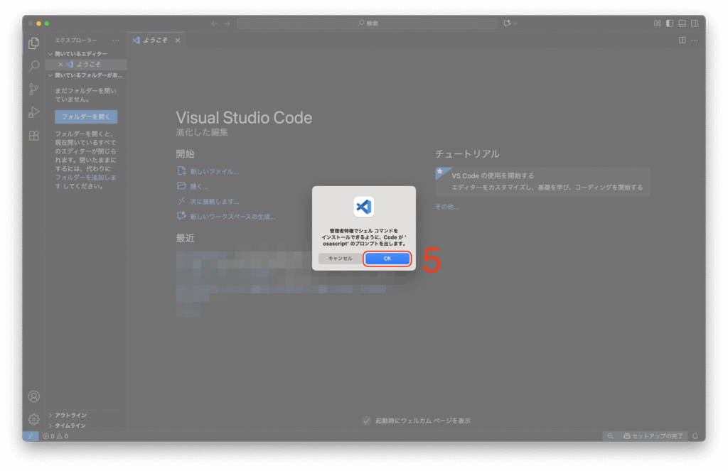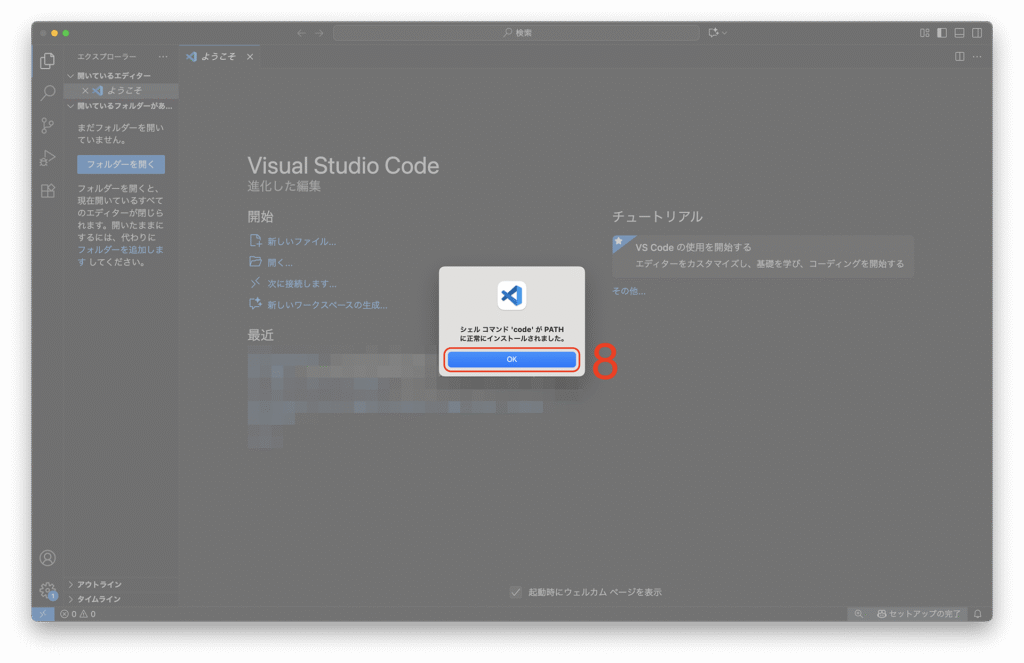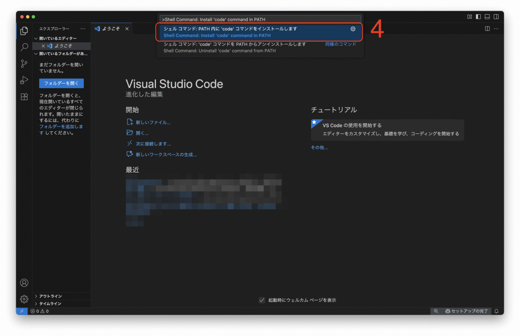 4: [シェルコマンド:PATH内に’code’コマンドをインストールします]をクリックします。