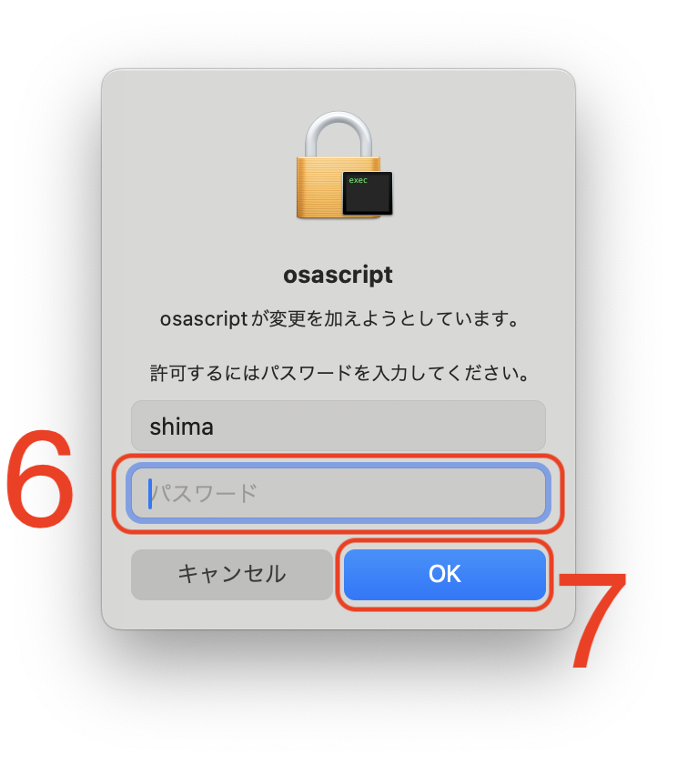 6: [パスワード]ボックスに、Macのパスワードを入力します。